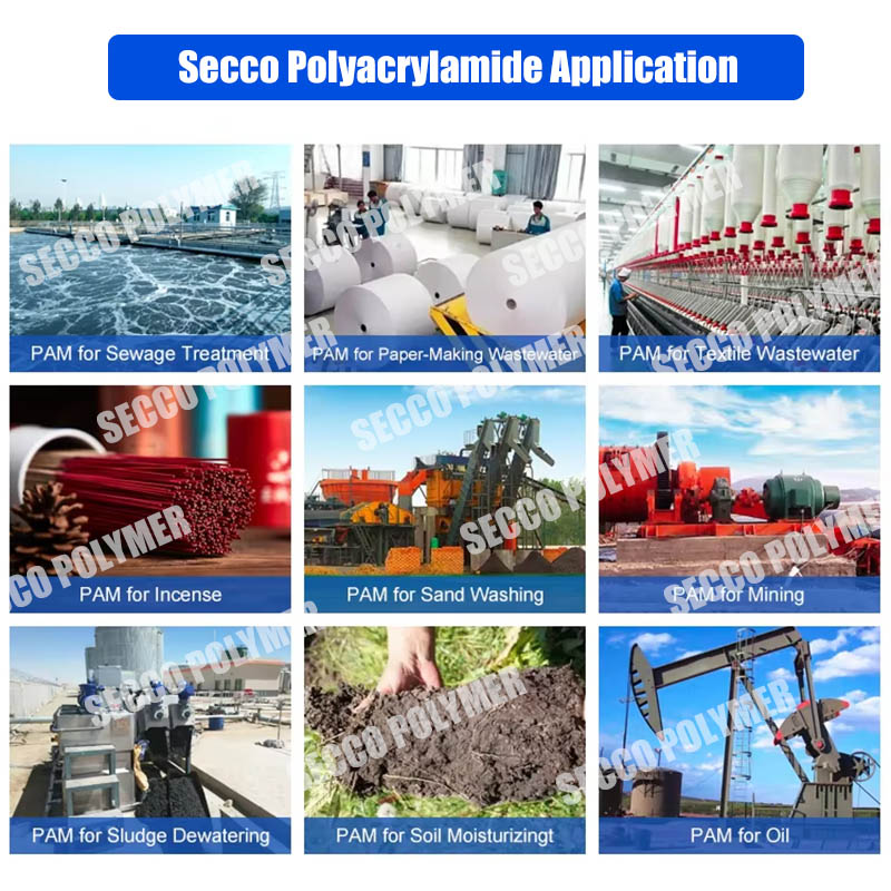 Emulsja poliakrylamidu jest szeroko stosowana w różnych ściekach domowych, ściekach chemicznych, ściekach z pól naftowych, odwodnianiu osadów, papierze i innych dziedzinach. Emulsja wody w oleju poliakrylamidu jest również szeroko stosowana w oczyszczaniu ścieków miejskich, browarze, fabryce skrobi, zakładach przetwarzania żywności i innych oczyszczaniach ścieków. Szczególnie stosowne jest usuwanie flokulacji zawiesionych organicznych substancji stałych w kwaśnych lub kwaśnych ściekach. W przemyśle papierniczym może być stosowany jako filtr pomocniczy w utrzymaniu, oczyszczanie ścieków papierniczych. Przemysł naftowy może być używany jako środek powlekania emulsji wiertniczej lub środek odtłuszczający.